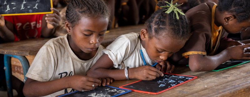 Siden 2010 har flere tusen barn fått skolegang, men situasjonen er fortsatt tøff: Bare ett av to barn fullfører grunnskolen. Mange av dem begynner heller å jobbe for å bidra til en tøff familieøkonomi. Noen blir tidlig gravide. Andre har for lang skolevei. UNICEF på Madagaskar ser likevel at det begynner å bli stadig vanligere å være elev, og at både familier og myndigheter satser mer på utdanning. I samarbeid med UNICEF får mange også mat på skolene i regi av Verdens Matvareprogram (WFP).