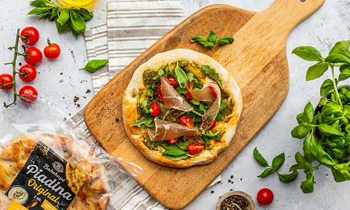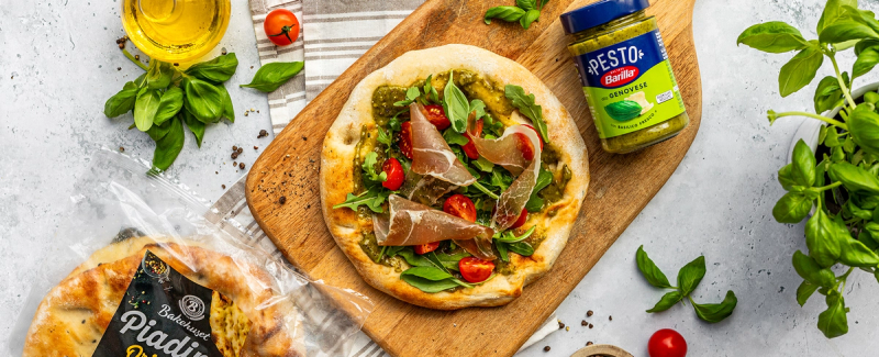 Varm piadinaen etter anvisning på pakken. Spre pesto over brødet og legg på spekeskinke, tomater og urter til slutt.