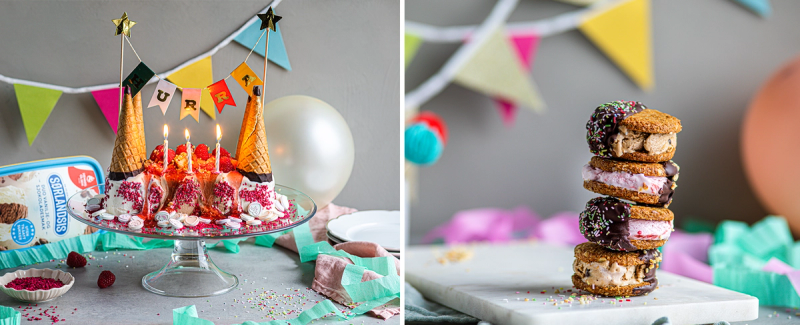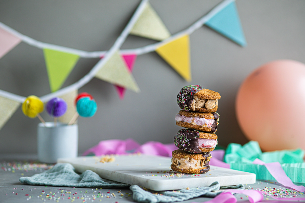 Lag enkle og supergode iskremsandwicher som både små og store bursdagsgjester vil elske! Her har vi brukt Idyll plantebasert is, i smakene jordbær og salt karamell. Ikke bare smaker det godt, det er også perfekt om du trenger å ta hensyn til gjester med melkeallergi eller som er veganere. Ta en kule is, legg den mellom to kjeks og press godt sammen. Smelt mørk sjokolade og dypp halvparten av sandwichen før du strør på ønsket strøssel. Legg dem på et brett og sett det tilbake i fryseren til de skal serveres.