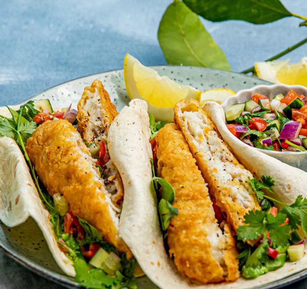 Sprø fisketaco med digg tilbehør