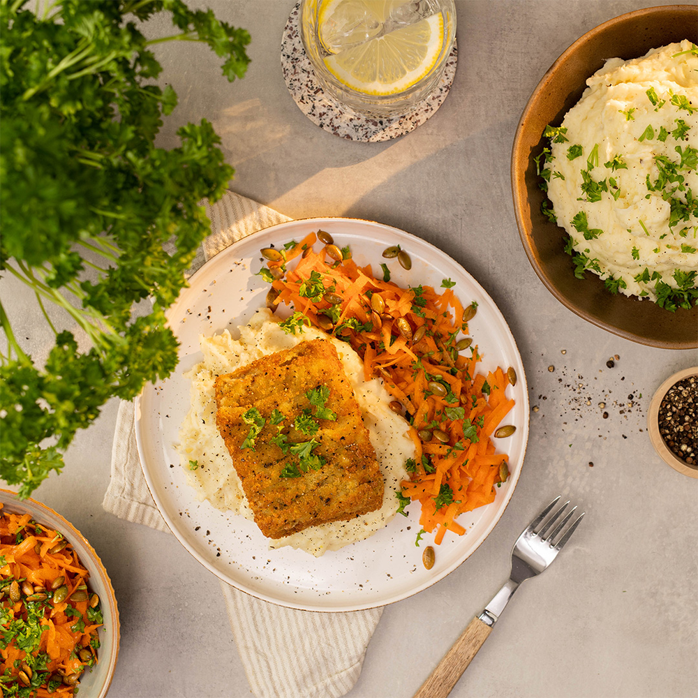 - Server fisken med deilig gulrotsalat og potetmos, pynt gjerne med frisk kruspersille.