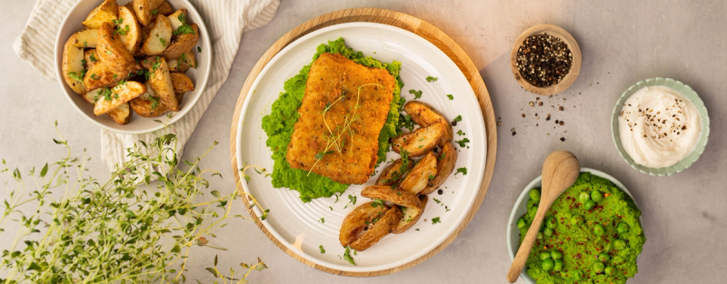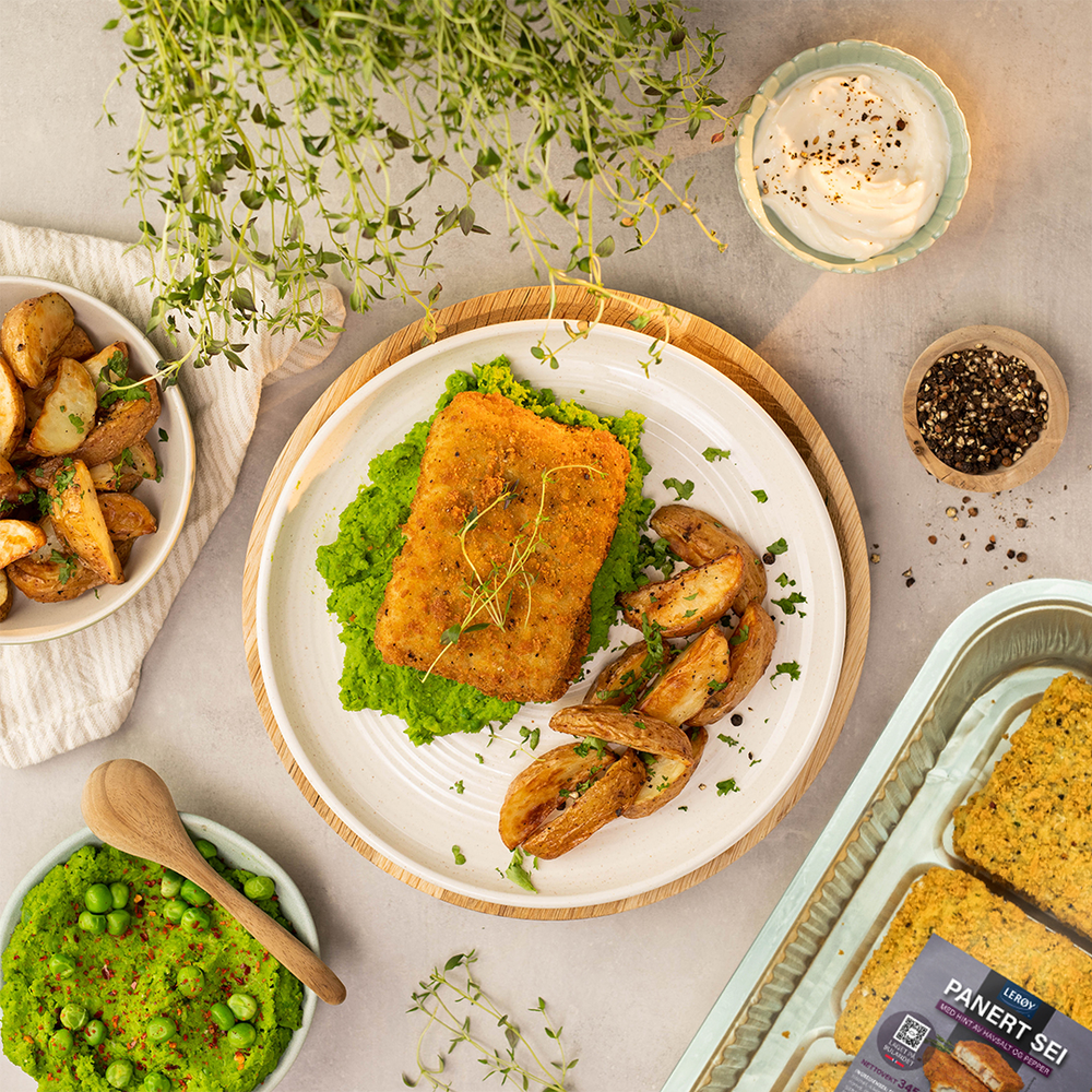 Panert sei med ertepuré og ovnsbakte potetbåter