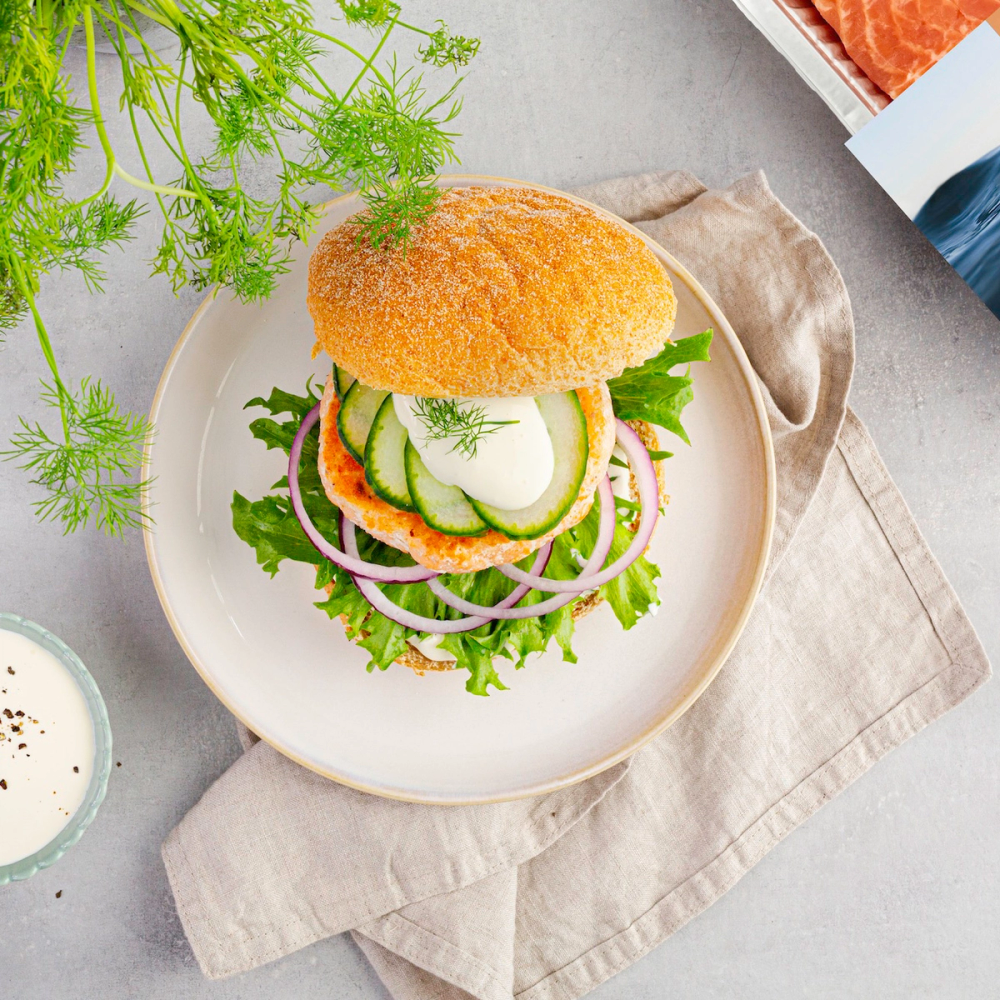 - Del burgerbrødene i to og ha på lettrømme, salatblad, rødløk og agurk. Topp det hele med fiskeburgeren og server.
