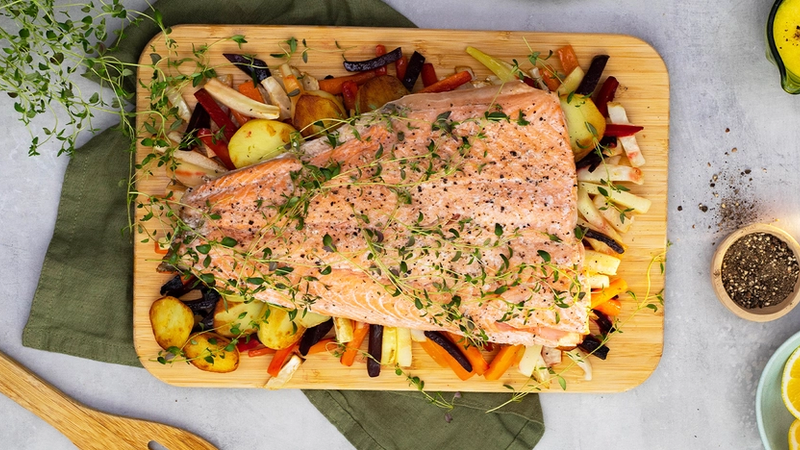 - Legg laksen på grønnsakene, dryss over salt og pepper, og ringle over litt olje.