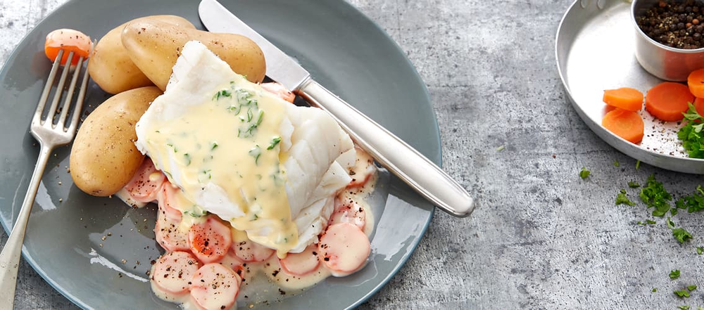 En av de mest klassiske variantene, er torsk servert med kokte poteter, erter og Sandefjordsmør. Dette er kanskje den mest populære hvite fiskesausen vi har, og lages enkelt med få ingredienser: