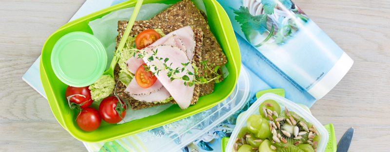 Prøv grove brødskiver med fornuftig pålegg og grønnsaker. Alternativt kan brød byttes ut med knekkebrød, søtpotetlomper eller grove vafler for variasjon.