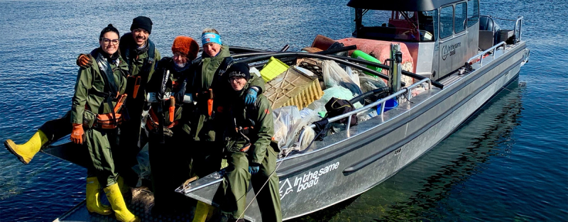 In The Same Boat består av unge voksne fra hele verden som jobber som frivillig mannskap på deres fartøy. Sammen rydder de hvert år flere hundre tonn plast fra norske strender.