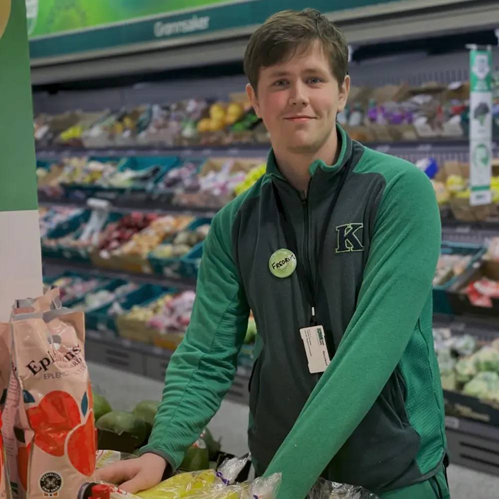 Fredrik var lærerstudent med deltidsjobb i KIWI. Tre år senere går han KIWIs traineeprogram og har god fart mot å målet om å drive egen butikk – i tillegg ble han denne våren kåret til landets hyggeligste kassemedarbeider.