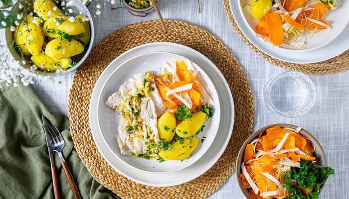 Denne torskemiddagen med fyldig eggesmør og frisk råkostsalat er en skikkelig klassiker. Perfekt om du får svigerfamilien på besøk. Oppskriften gir 4 porsjoner.