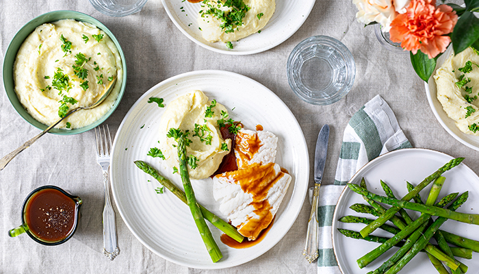 Juletorsk med selleri- og potetpure, asparges og rødvinssaus