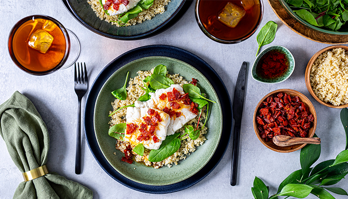 - Server nytrukket torsk med quinoa, choritzoblanding og en god håndfull salatmiks.