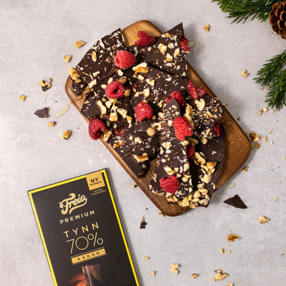 - Finhakk en håndfull med valnøtter. Strø deretter valnøttene og bringebær over sjokoladen.