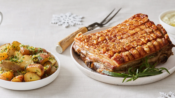 - Stek ribbensteken i 60 minutter på 220 °C. Fjern toppfilmen helt og stek videre i ca. 30-50 minutter til svoren er sprø.