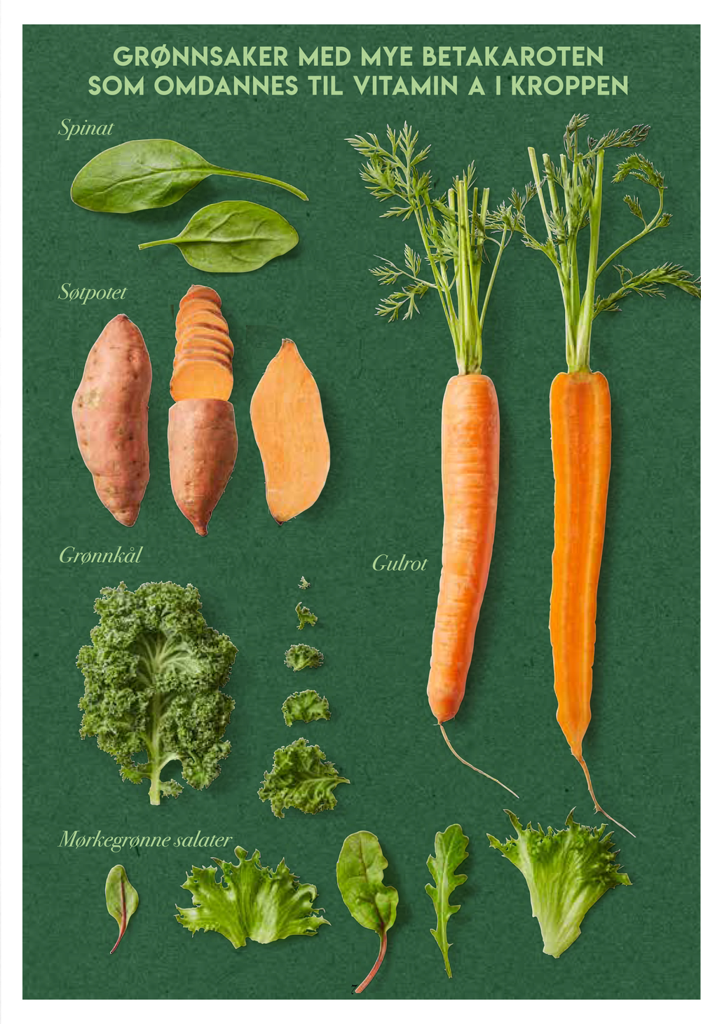 A-vitamin får vi i oss igjennom karotenoidet, eller betakaroten, som vi finner i grønnsaker og frukt, som videre omdannes til aktivt A-vitamin i kroppen.