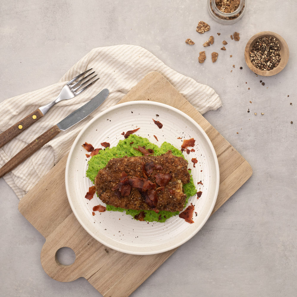 3. Panert torsk med ertestuing og sprøstekt spekeskinke