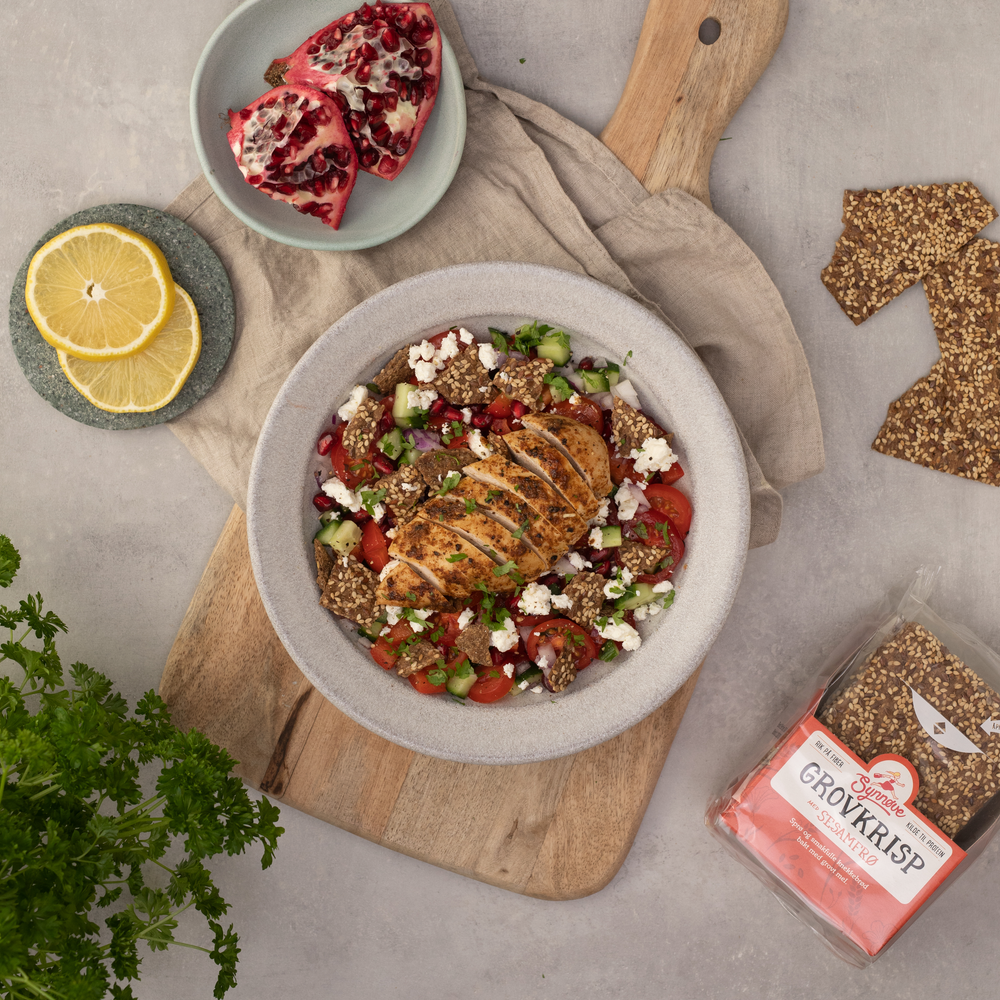 - Server kyllingen sammen med salaten. Smuldre over fetaosten, dryss over granateplekjerner, og knekk knekkebrødet som krutonger.