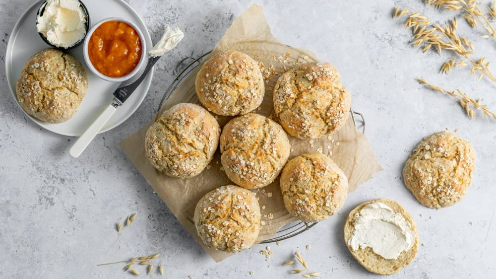 Havren gir disse enkle, eltefrie rundstykkene en deilig nøtteaktig smak. De krever få ingredienser og er klare på et par timer. Du kan også lage deigen kvelden i forveien, så går det ekstra raskt å få rundstykkene i ovnen på morgenen. Server med fars favorittpålegg og noe godt å drikke.