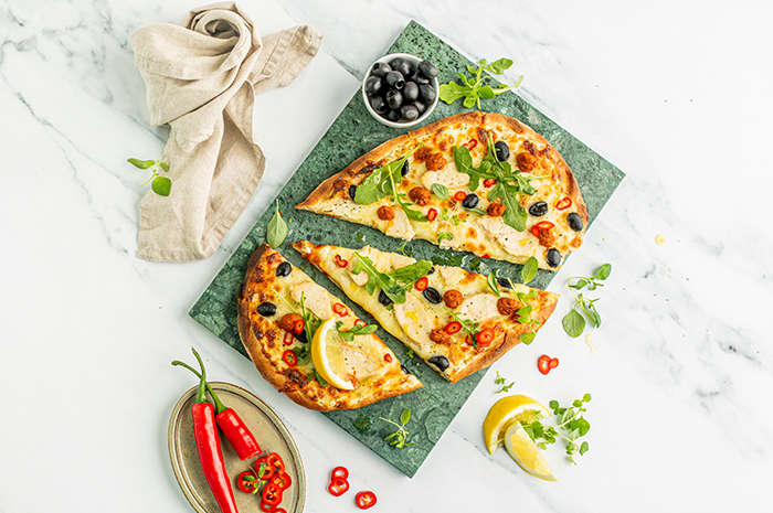 - Fordel et jevnt lag med Eldorado hvit pizzasaus over begge pinsaene.