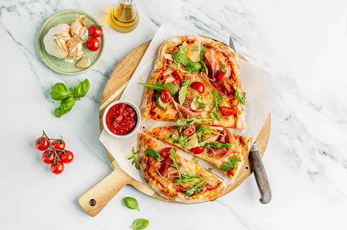 - Topp den nystekte pinsaen med frisk ruccola, basilikum, parmaskinke, cherrytomater og høvlet Grana Padano.