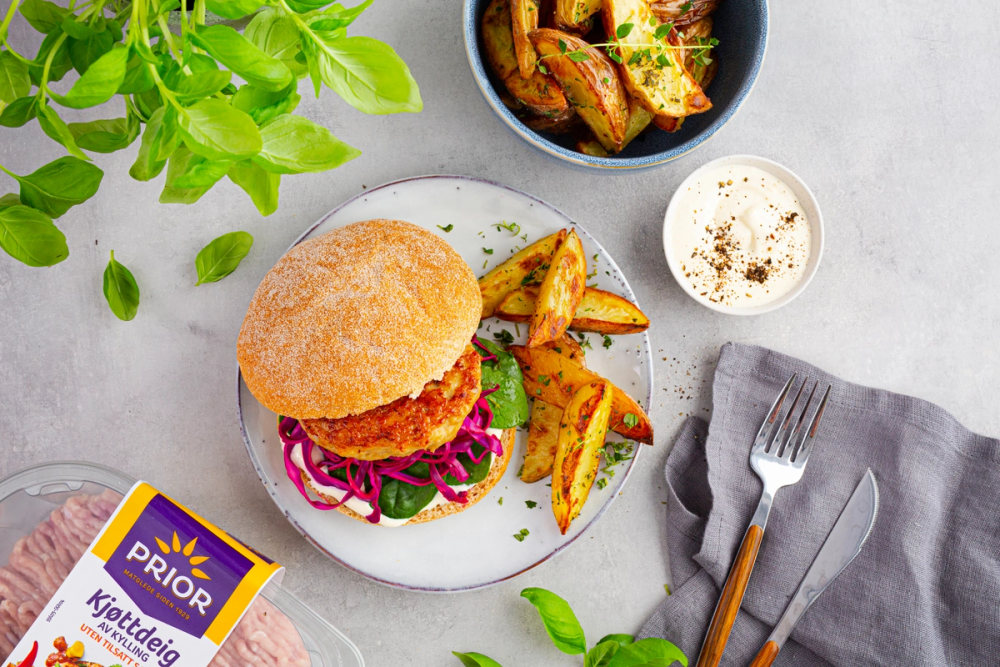 - Skjær hamburgerbrødene i to og ha på parmesandressing, babyleaf, hurtigsyltet rødløk og kyllingburger. Server med båtpoteter og parmesandressing.