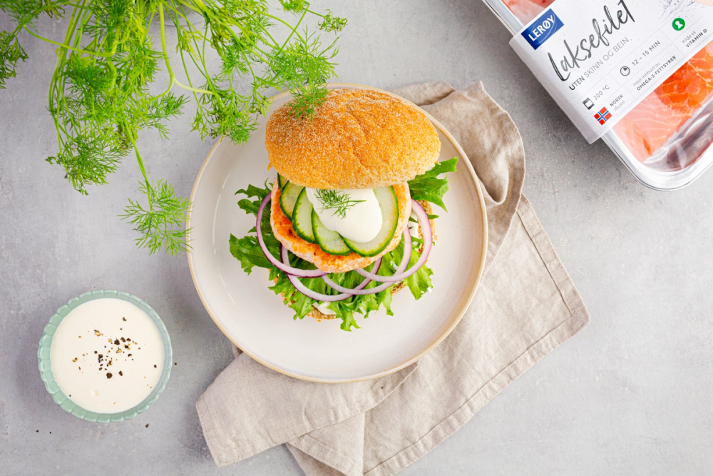 - Del burgerbrødene i to og ha på lettrømme, salatblad, rødløk og agurk. Topp det hele med fiskeburgeren og server. Vel bekomme!