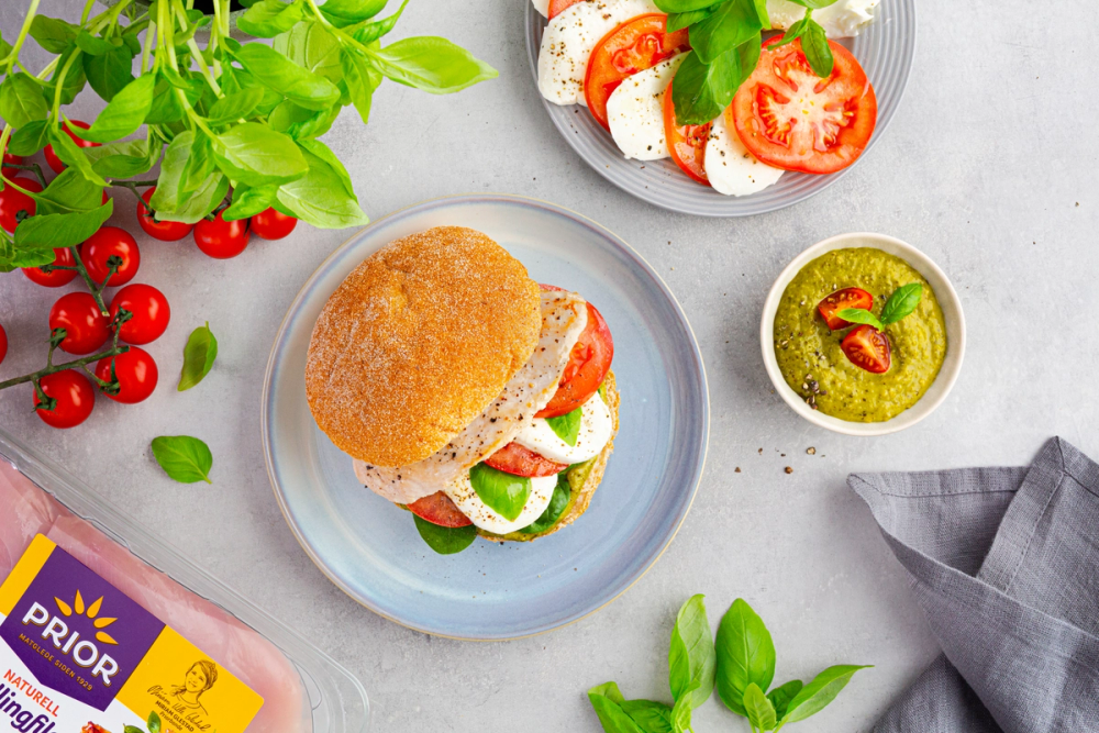 - Server kyllingen i burgerbrød sammen med pestodressing, tomatskiver, mozzarellaskiver, frisk basilikum, en god olivenolje, salt og pepper.