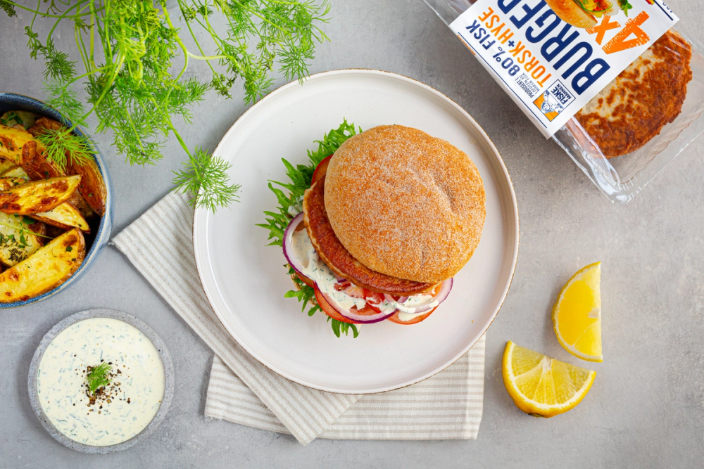 - Del hamburgerbrød og ha ishavsdressing, salat, tomatskiver, rødløkskiver og fiskeburger. Server gjerne med ovnsbakte, dill, sitron og ishavsdressing ved siden av. Vel bekomme!