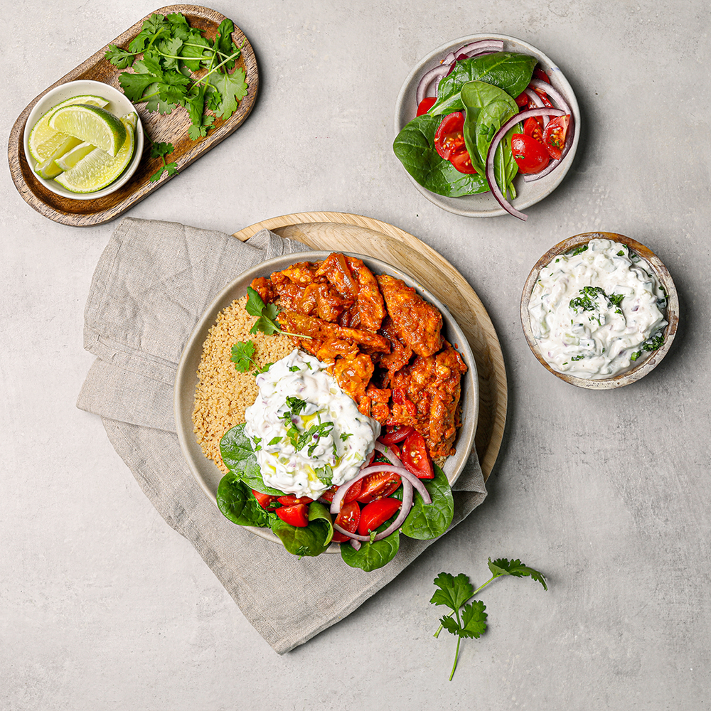 5. Server retten som en bowl med couscous, frisk salat, tikka masala kylling og frisk raita.