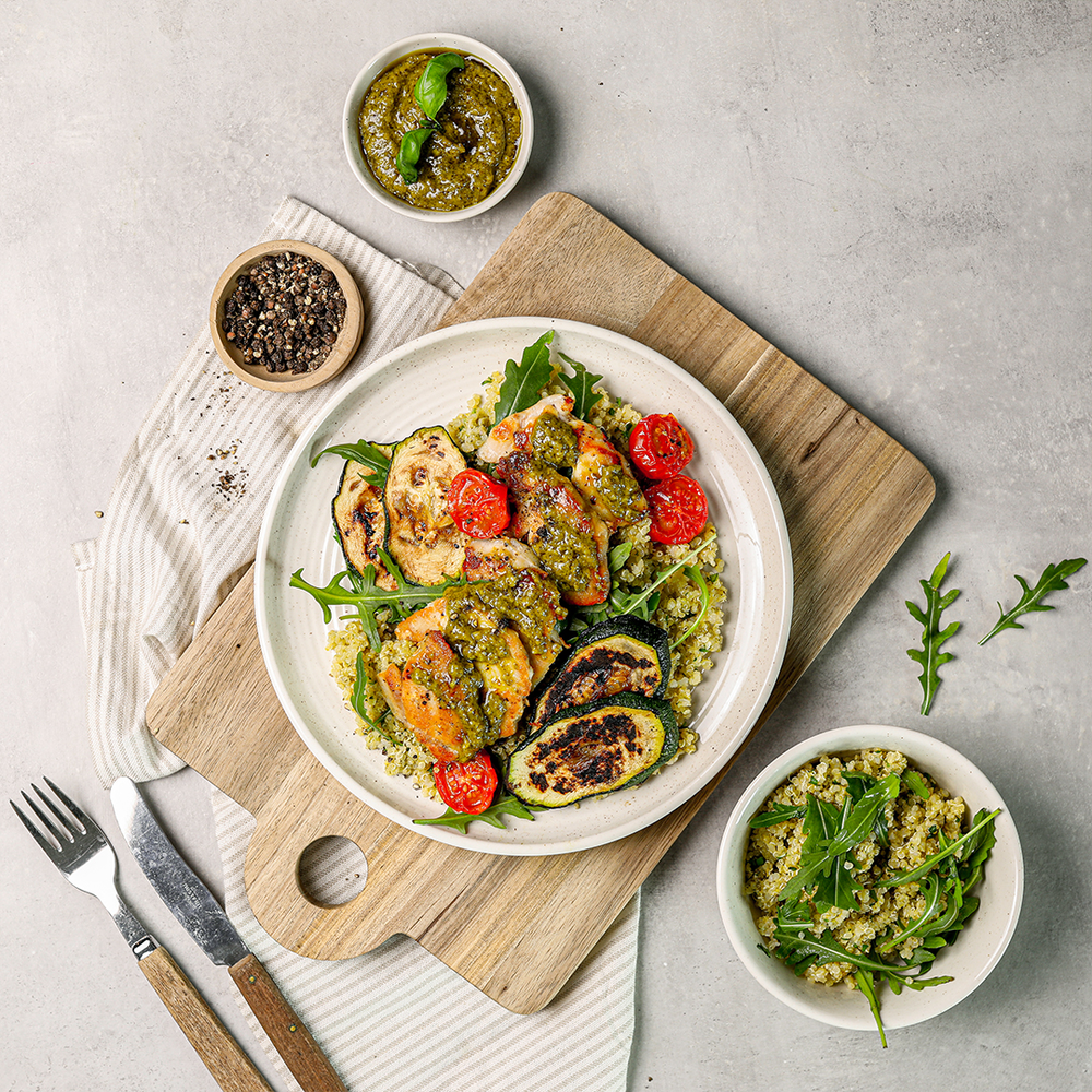 - Server kylling og grønnsaker med pesto-quinoa og frisk ruccola på toppen.