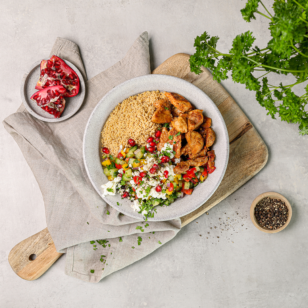 - Server kyllingen sammen med couscous og frisk salat. Smuldre over osten og dryss over granateplekjerner.