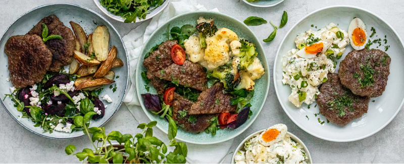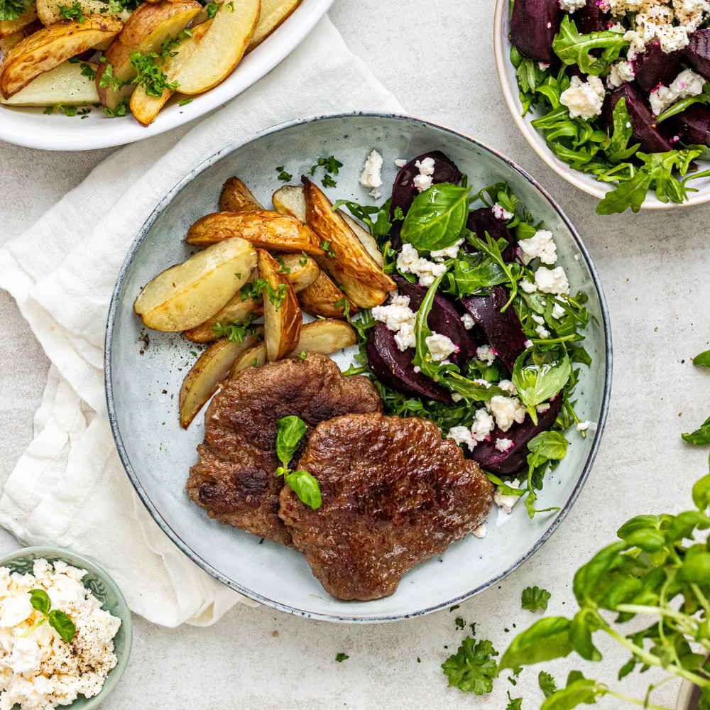 3. Karbonader med rødbetsalat og ovnsbakte potetbåter