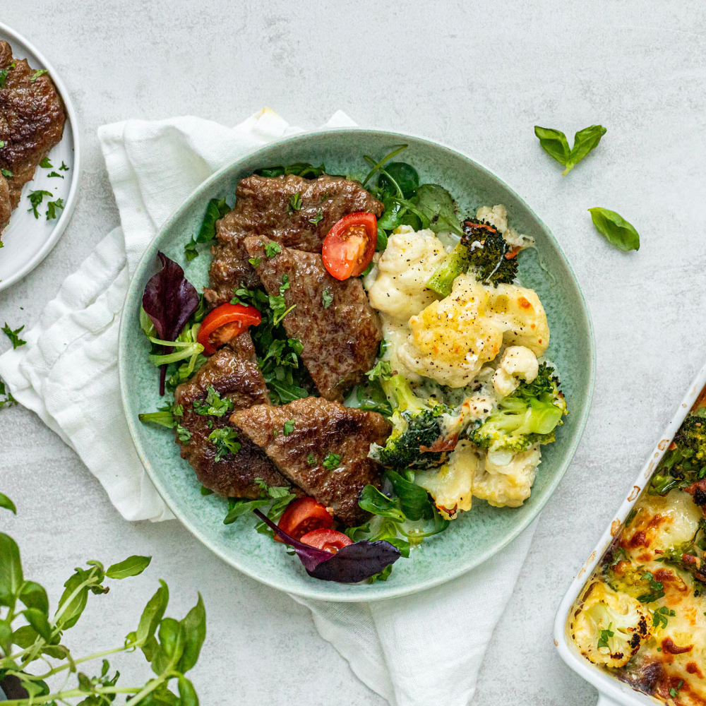 2. Karbonader med brokkoli- og blomkålgrateng