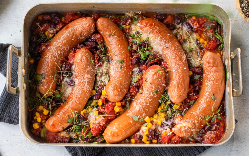 - Skyll kidneybønnene og vend sammen med knuste tomater, spinat og mais. Krydre blandingen med salt og pepper, og ha alt i en ildfast form med pølsene.