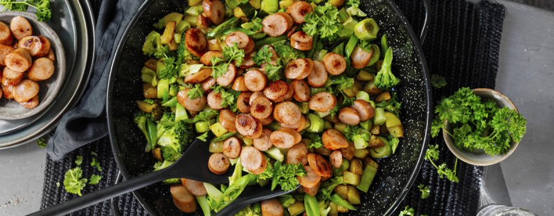 - Kutt pølse, potet, brokkoli, purre og hvitløk i biter.
