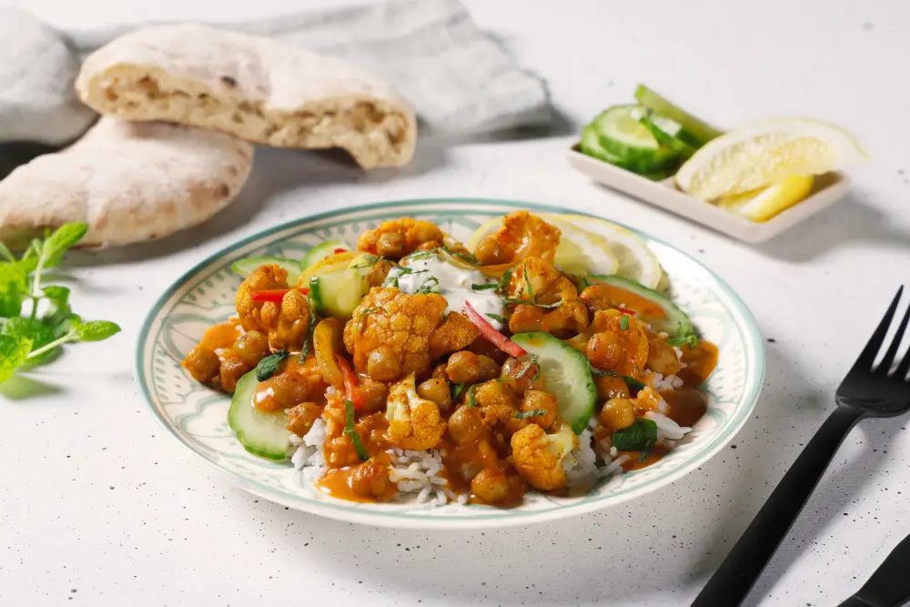Denne vegetariske varianten byr på en mildt krydret grønnsaksrett med blomkål og kikerter, servert i mykt pitabrød. Retten har en rund og fyldig saus, mens en frisk yoghurtdressing med mynte setter prikken over i-en. Topp gjerne med chili og koriander for ekstra smak, og server med agurk og sitron for et friskt løft.
