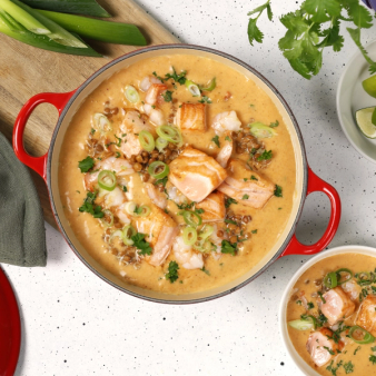 Vil du imponere med en ekstra smakfull gryte, er dette oppskriften. Kombinasjonen av laks, scampi, linser og et hint av rød curry gir en luksuriøs vri på en kjent favoritt. Server med ris eller nudler, og topp med vårløk, lime og koriander.