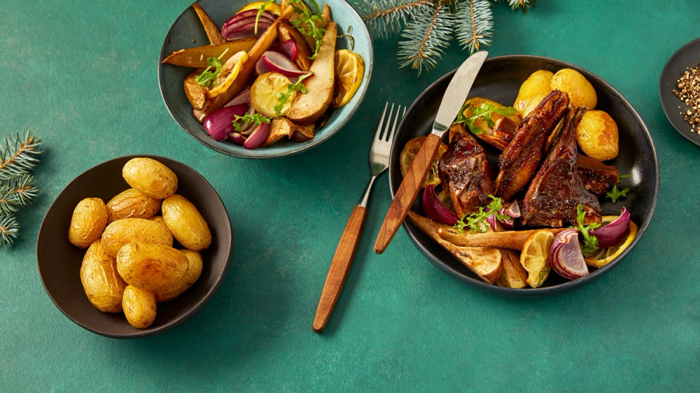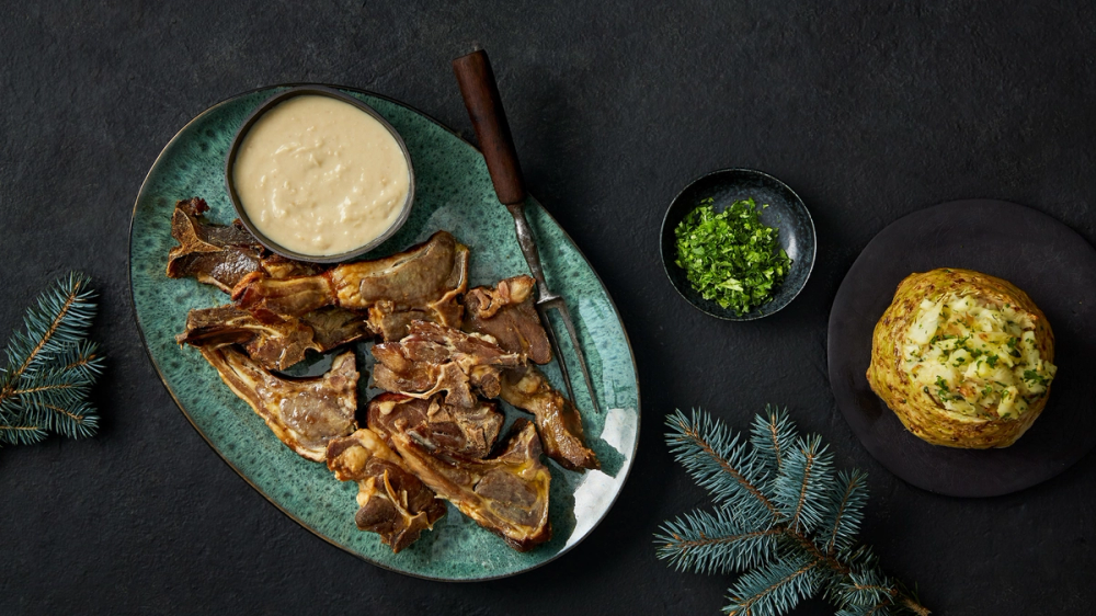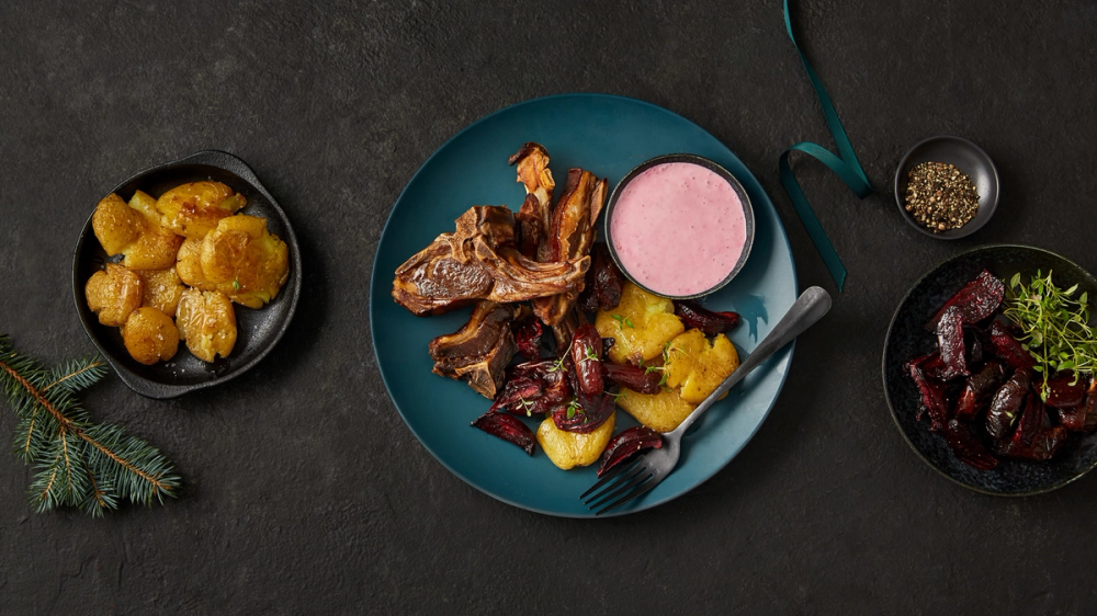 8. Pinnekjøtt med smashede poteter, ovnsbakte rødbeter og dadler