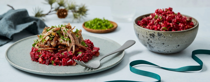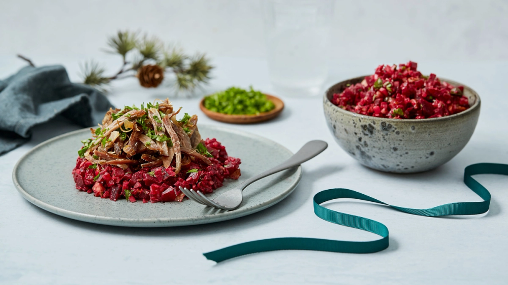 4. Rødbettartar med sprøstekt pinnekjøtt