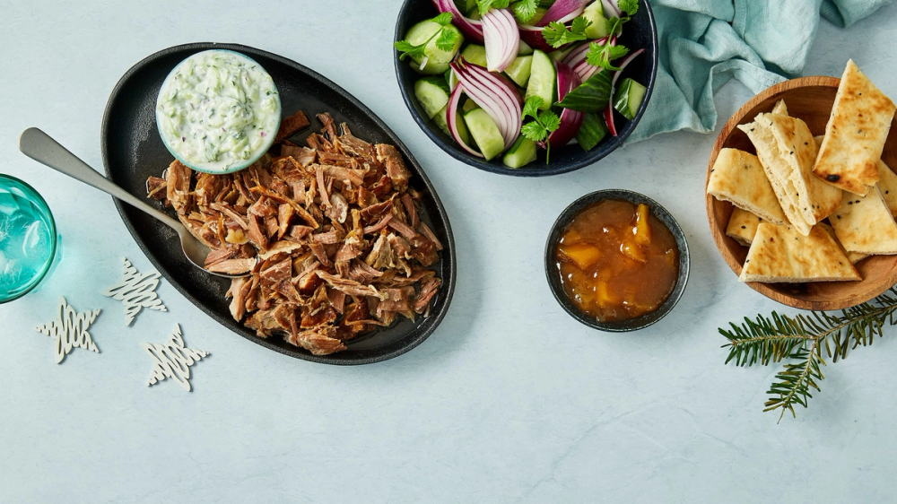 10. Pinnekjøtt med raita, rødløk- og agurksalat, naanbrød og mangochutney