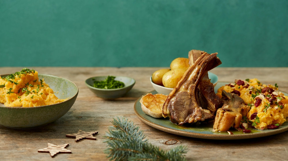 3. Dampet pinnekjøtt med rotmos, bakt hvitløk, ovnsbakte poteter og brunet smør