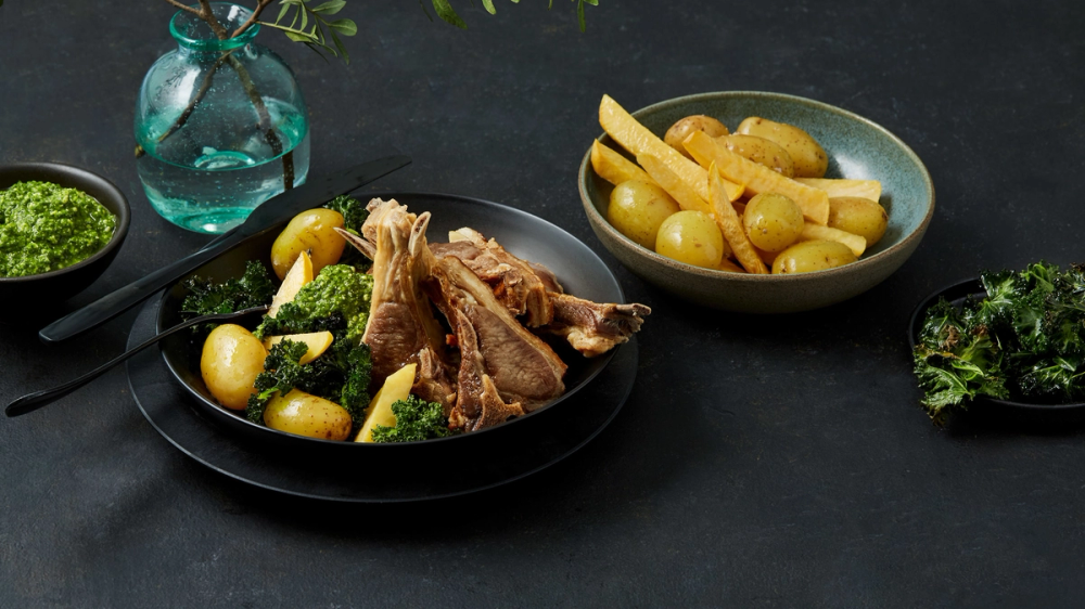 2. Dampet og stekt pinnekjøtt med roasta kålrot, sprø grønnkål og grønnkålpesto