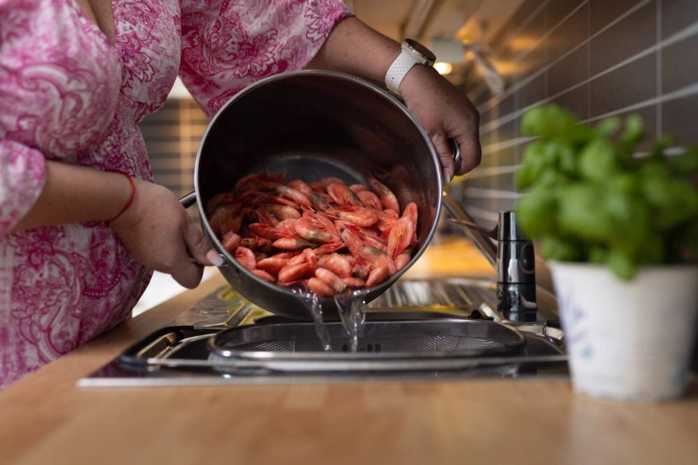 Akkurat i dag har de ikke ferdig tinte reker tilgjengelig, og trenger å tine de frosne rekene før sulten tar overhånd. Anita vet råd.