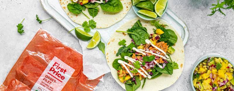 - Topp tortillalefsene med litt salat, mango- og avokadosalsa, lettrømme og koriander.