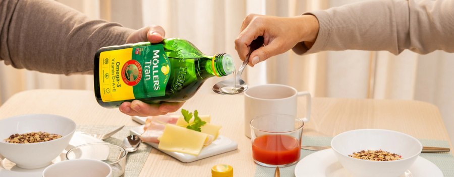En stor teskje, 5 ml med Möller's Tran, som er den anbefalte dagsdosen for alle over 3 år, dekker dagsbehovet for de essensielle omega-3-fettsyrene.