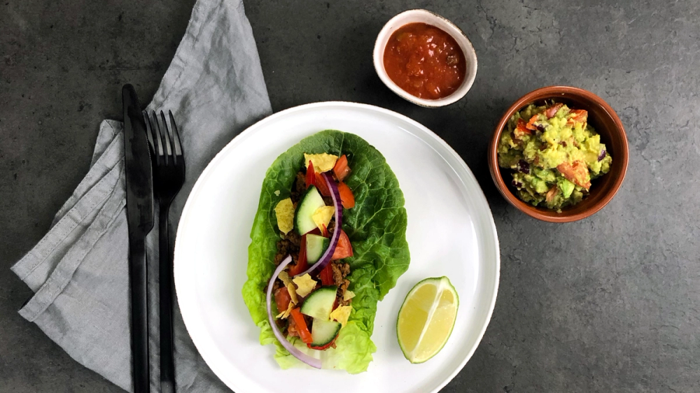 - Fyll fire hjertesalatblader med tacokrydret kjøttdeig, fisk, kylling eller bønner og grønnsaker.