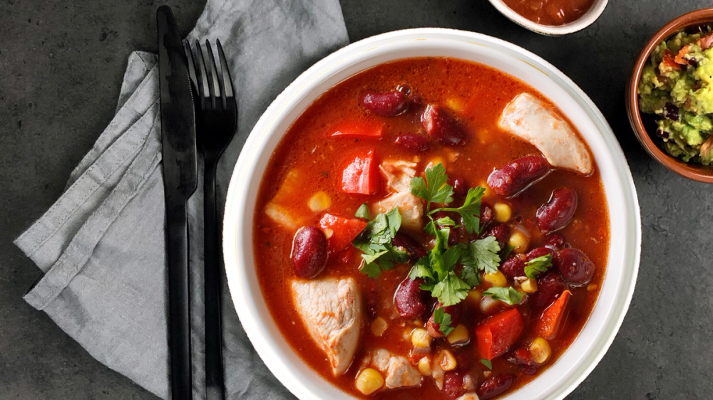 - Hell den ferdige suppen i skåler og topp med rester av tacokrydret kylling, ost, rømme, mais og knuste tortillachips.