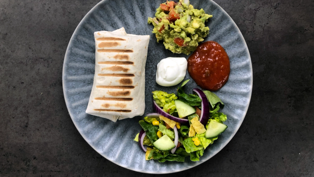 - Server den ferdigstekte burritoen med rømme, tacosaus, guacamole og en salat.