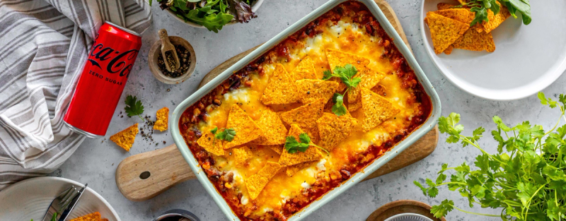 Kombinasjonen av sprø tortilla chips, fyldig kjøttsaus og smeltet ost gjør denne retten til et skikkelig godt måltid for hele familien. Enkel å lage er den også! Server med guacamole, salsa, frisk babyleaf-salat og en iskald Coca-Cola Zero Sugar for en komplett smaksopplevelse.