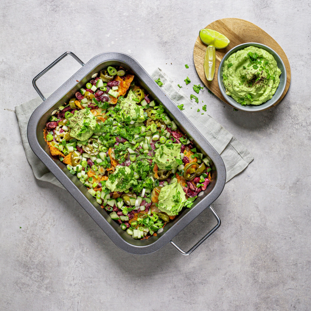 - Server den varme nachosen med avokadokrem og dryss over vårløk, agurk og koriander ved servering.