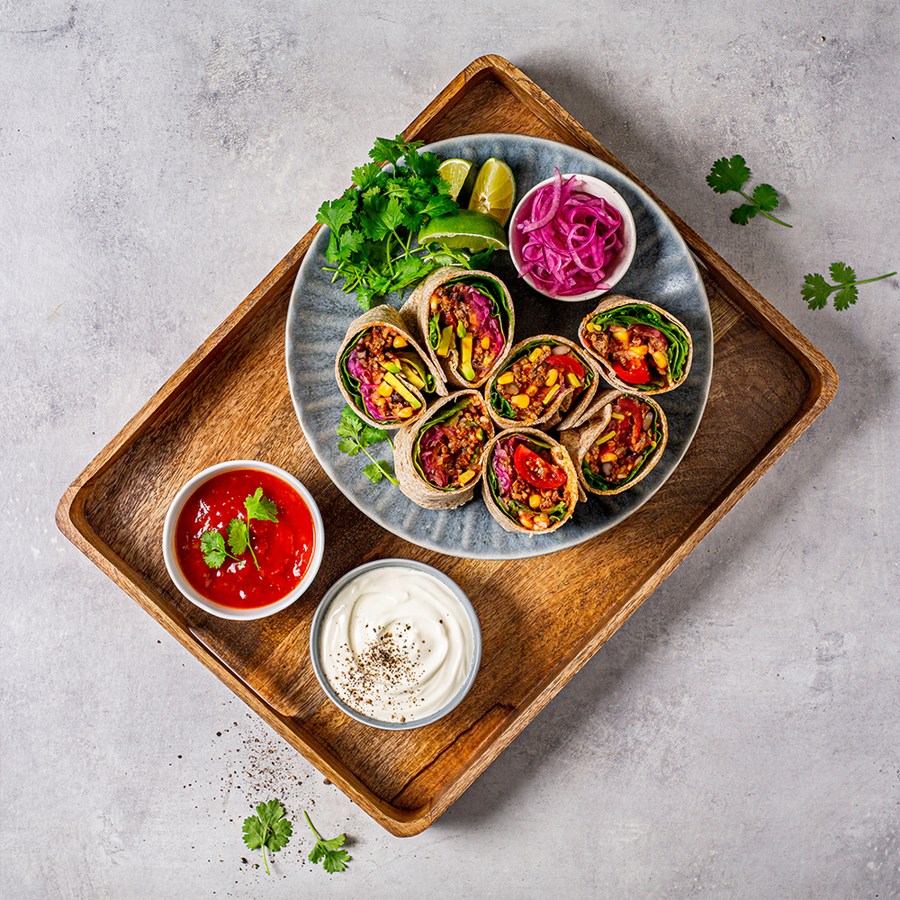 - Fyll tortillaen med crispisalat, grønnsaker og kjøttdeigblanding. Rull sammen og brett inn endene, slik at du får en tett rull.